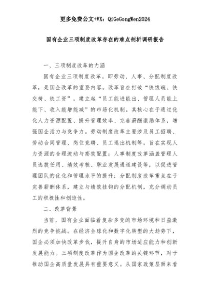 【七哥公文】2025年:国有企业三项制度改革存在的难点剖析调研报告+更多免费公文+VX:QiGeGongWen2024+更多免费公文+VX:QiGeGongWen2024