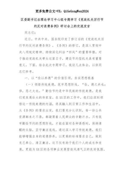 【七哥公文】2025年:区委副书记在理论学习中心组专题学习《党政机关厉行节约反对浪费条例》研讨会上的交流发言+更多免费公文+VX:QiGeGongWen2024+更多免费公文+VX:QiGeGongWen2024