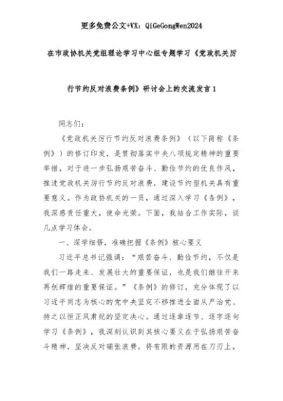 【七哥公文】2025年:在市政协机关党组理论学习中心组专题学习《党政机关厉行节约反对浪费条例》研讨会上的交流发言1+更多免费公文+VX:QiGeGongWen2024+更多免费公文+VX:QiGeGongWen2024