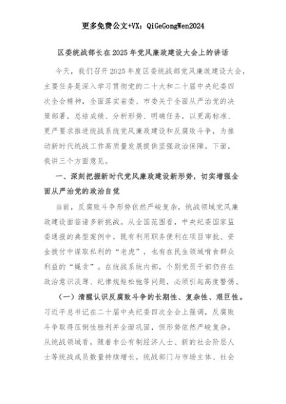 【七哥公文】2025年:区委统战部长在2025年党风廉政建设大会上的讲话+更多免费公文+VX:QiGeGongWen2024+更多免费公文+VX:QiGeGongWen2024