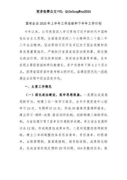 【七哥公文】2025年:国有企业2025年上半年工作总结和下半年工作计划+更多免费公文+VX:QiGeGongWen2024+更多免费公文+VX:QiGeGongWen2024
