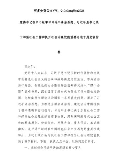 【七哥公文】2025年:党委书记在中心组学习习近平法治思想、习近平总书记关于加强社会工作和提升社会治理效能重要论述专题发言材料+更多免费公文+VX:QiGeGongWen2024+更多免费公文+VX:QiGeGongWen2024