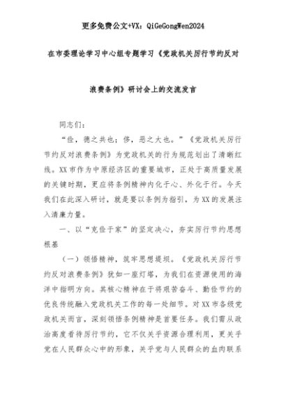 【七哥公文】2025年:在市委理论学习中心组专题学习《党政机关厉行节约反对浪费条例》研讨会上的交流发言+更多免费公文+VX:QiGeGongWen2024+更多免费公文+VX:QiGeGongWen2024