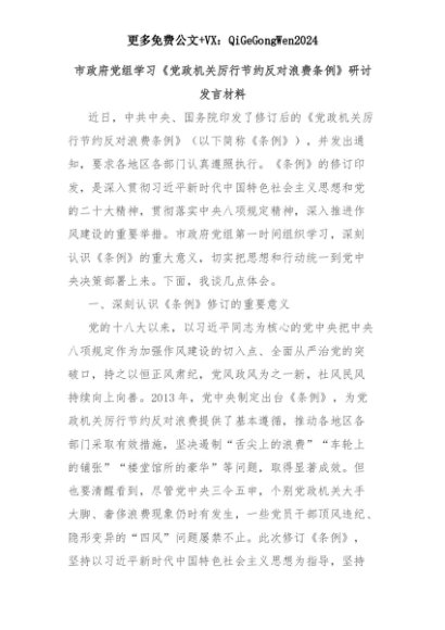 【七哥公文】2025年:市政府党组学习《党政机关厉行节约反对浪费条例》研讨发言材料+更多免费公文+VX:QiGeGongWen2024+更多免费公文+VX:QiGeGongWen2024