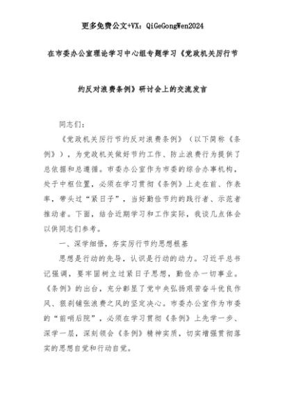【七哥公文】2025年:在市委办公室理论学习中心组专题学习《党政机关厉行节约反对浪费条例》研讨会上的交流发言+更多免费公文+VX:QiGeGongWen2024+更多免费公文+VX:QiGeGongWen2024