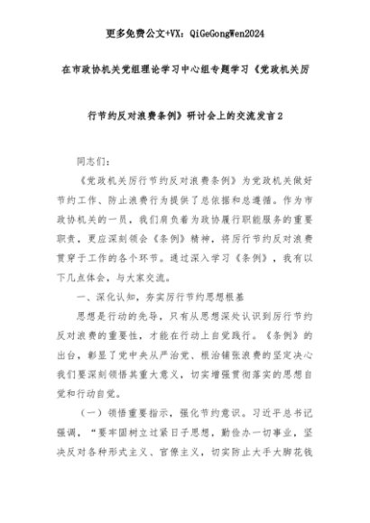【七哥公文】2025年:在市政协机关党组理论学习中心组专题学习《党政机关厉行节约反对浪费条例》研讨会上的交流发言2+更多免费公文+VX:QiGeGongWen2024+更多免费公文+VX:QiGeGongWen2024