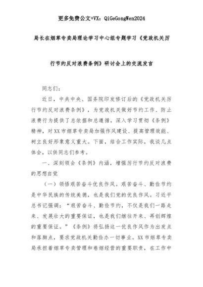 【七哥公文】2025年:局长在烟草专卖局理论学习中心组专题学习《党政机关厉行节约反对浪费条例》研讨会上的交流发言+更多免费公文+VX:QiGeGongWen2024+更多免费公文+VX:QiGeGongWen2024