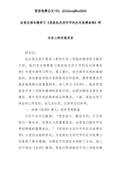 【七哥公文】2025年:在党支部专题学习《党政机关厉行节约反对浪费条例》研讨会上的交流发言+更多免费公文+VX:QiGeGongWen2024+更多免费公文+VX:QiGeGongWen2024