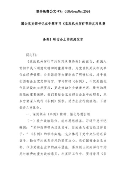 【七哥公文】2025年:国企党支部书记在专题学习《党政机关厉行节约反对浪费条例》研讨会上的交流发言+更多免费公文+VX:QiGeGongWen2024+更多免费公文+VX:QiGeGongWen2024