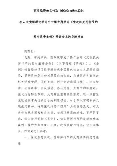 【七哥公文】2025年:在人大党组理论学习中心组专题学习《党政机关厉行节约反对浪费条例》研讨会上的交流发言+更多免费公文+VX:QiGeGongWen2024+更多免费公文+VX:QiGeGongWen2024