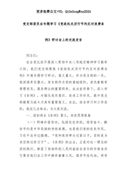 【七哥公文】2025年:党支部委员在专题学习《党政机关厉行节约反对浪费条例》研讨会上的交流发言+更多免费公文+VX:QiGeGongWen2024+更多免费公文+VX:QiGeGongWen2024