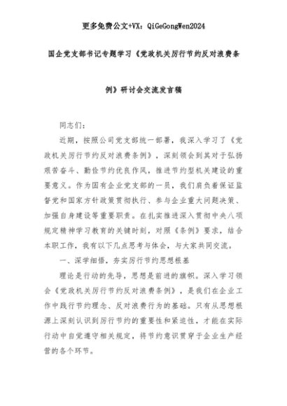 【七哥公文】2025年:国企党支部书记专题学习《党政机关厉行节约反对浪费条例》研讨会交流发言稿+更多免费公文+VX:QiGeGongWen2024+更多免费公文+VX:QiGeGongWen2024
