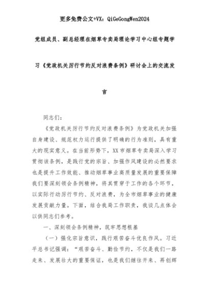 【七哥公文】2025年:党组成员、副总经理在烟草专卖局理论学习中心组专题学习《党政机关厉行节约反对浪费条例》研讨会上的交流发言+更多免费公文+VX:QiGeGongWen2024+更多免费公文+VX:QiGeGongWen2024