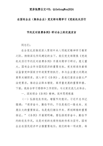 【七哥公文】2025年:在国有企业(集体企业)党支部专题学习《党政机关厉行节约反对浪费条例》研讨会上的交流发言+更多免费公文+VX:QiGeGongWen2024+更多免费公文+VX:QiGeGongWen2024