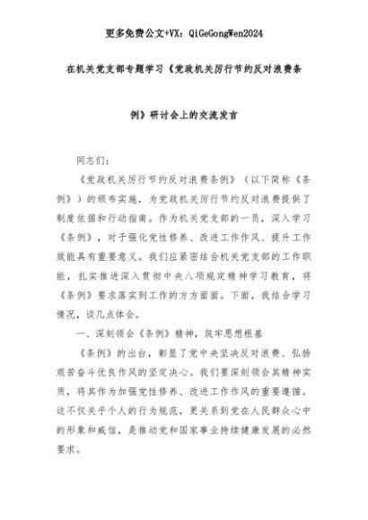 【七哥公文】2025年:在机关党支部专题学习《党政机关厉行节约反对浪费条例》研讨会上的交流发言+更多免费公文+VX:QiGeGongWen2024+更多免费公文+VX:QiGeGongWen2024