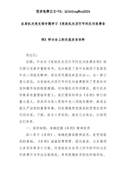 【七哥公文】2025年:在局机关党支部专题学习《党政机关厉行节约反对浪费条例》研讨会上的交流发言材料+更多免费公文+VX:QiGeGongWen2024+更多免费公文+VX:QiGeGongWen2024