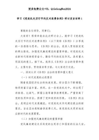 【七哥公文】2025年:学习《党政机关厉行节约反对浪费条例》研讨发言材料1+更多免费公文+VX:QiGeGongWen2024+更多免费公文+VX:QiGeGongWen2024
