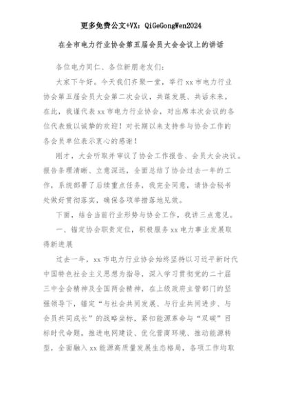 【七哥公文】2025年:在全市电力行业协会第五届会员大会会议上的讲话+更多免费公文+VX:QiGeGongWen2024+更多免费公文+VX:QiGeGongWen2024