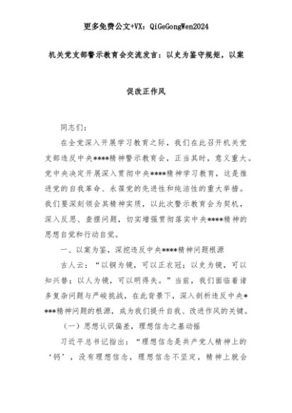 【七哥公文】2025年:机关党支部警示教育会交流发言:以史为鉴守规矩,以案促改正作风+更多免费公文+VX:QiGeGongWen2024+更多免费公文+VX:QiGeGongWen2024