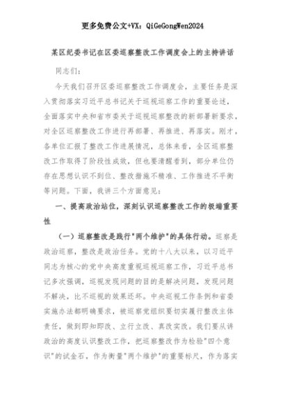 【七哥公文】2025年:某区纪委书记在区委巡察整改工作调度会上的主持讲话+更多免费公文+VX:QiGeGongWen2024+更多免费公文+VX:QiGeGongWen2024