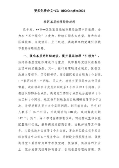 【七哥公文】2025年:社区基层治理经验材料+更多免费公文+VX:QiGeGongWen2024+更多免费公文+VX:QiGeGongWen2024