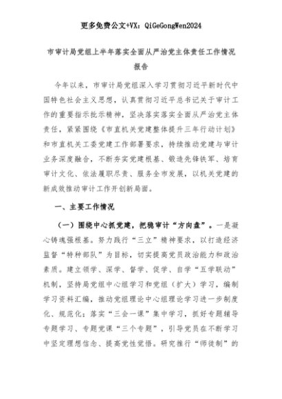 【七哥公文】2025年:市审计局党组上半年落实全面从严治党主体责任工作情况报告+更多免费公文+VX:QiGeGongWen2024+更多免费公文+VX:QiGeGongWen2024