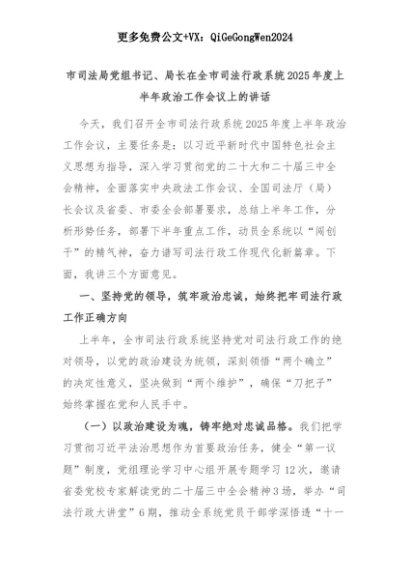 【七哥公文】2025年:市司法局党组书记、局长在全市司法行政系统2025年度上半年政治工作会议上的讲话+更多免费公文+VX:QiGeGongWen2024+更多免费公文+VX:QiGeGongWen2024