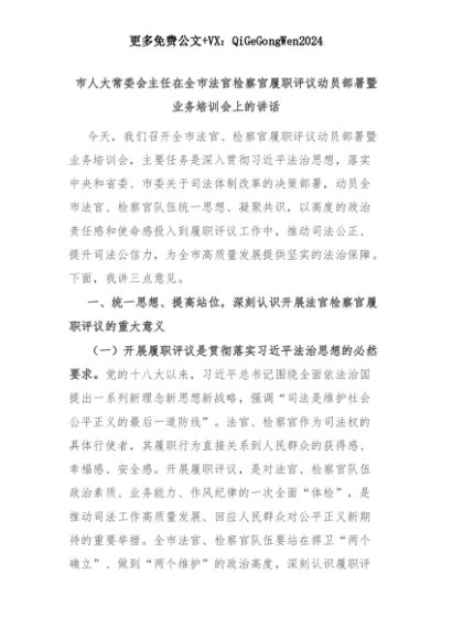 【七哥公文】2025年:市人大常委会主任在全市法官检察官履职评议动员部署暨业务培训会上的讲话+更多免费公文+VX:QiGeGongWen2024+更多免费公文+VX:QiGeGongWen2024