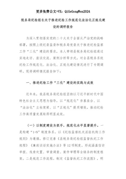 【七哥公文】2025年:税务局纪检组长关于推进纪检工作规范化法治化正规化建设的调研报告+更多免费公文+VX:QiGeGongWen2024+更多免费公文+VX:QiGeGongWen2024