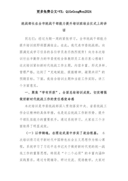 【七哥公文】2025年:统战部长在全市统战干部能力提升培训班结业仪式上的讲话+更多免费公文+VX:QiGeGongWen2024+更多免费公文+VX:QiGeGongWen2024