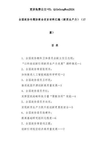 【七哥公文】2025年:(17篇)全国政协专题协商会发言材料汇编(新质生产力)+更多免费公文+VX:QiGeGongWen2024+更多免费公文+VX:QiGeGongWen2024