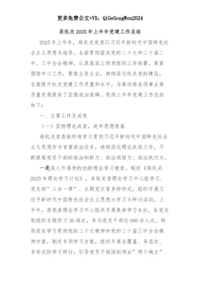 【七哥公文】2025年:局机关2025年上半年党建工作总结+更多免费公文+VX:QiGeGongWen2024+更多免费公文+VX:QiGeGongWen2024