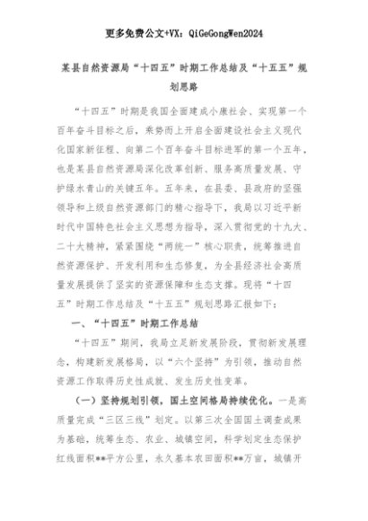 【七哥公文】2025年:某县自然资源局“十四五”时期工作总结及“十五五”规划思路+更多免费公文+VX:QiGeGongWen2024+更多免费公文+VX:QiGeGongWen2024