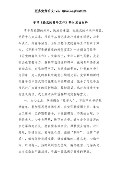 【七哥公文】2025年:学习《论党的青年工作》研讨发言材料+更多免费公文+VX:QiGeGongWen2024+更多免费公文+VX:QiGeGongWen2024