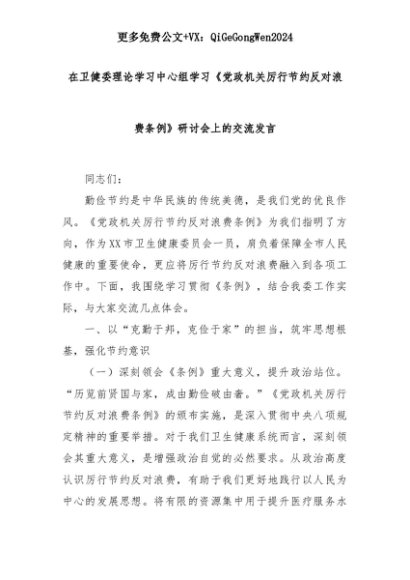 【七哥公文】2025年:在卫健委理论学习中心组学习《党政机关厉行节约反对浪费条例》研讨会上的交流发言+更多免费公文+VX:QiGeGongWen2024+更多免费公文+VX:QiGeGongWen2024