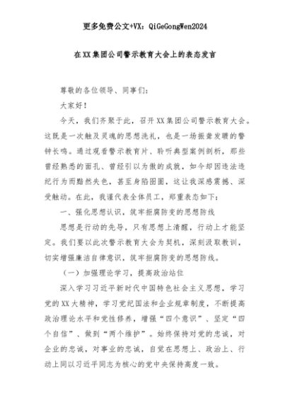 【七哥公文】2025年:在XX集团公司警示教育大会上的表态发言+更多免费公文+VX:QiGeGongWen2024+更多免费公文+VX:QiGeGongWen2024