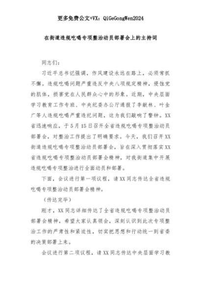 【七哥公文】2025年:在街道违规吃喝专项整治动员部署会上的主持词+更多免费公文+VX:QiGeGongWen2024+更多免费公文+VX:QiGeGongWen2024