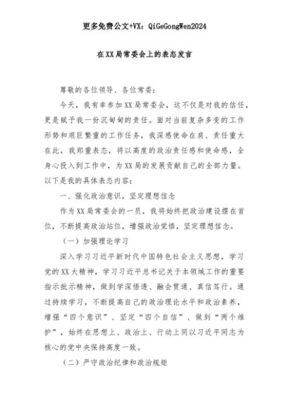 【七哥公文】2025年:在XX局常委会上的表态发言+更多免费公文+VX:QiGeGongWen2024+更多免费公文+VX:QiGeGongWen2024