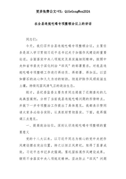 【七哥公文】2025年:在全县违规吃喝专项整顿会议上的讲话+更多免费公文+VX:QiGeGongWen2024+更多免费公文+VX:QiGeGongWen2024