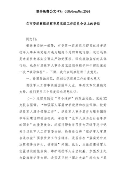 【七哥公文】2025年:在市委巡察组巡察市局党组工作动员会议上的讲话+更多免费公文+VX:QiGeGongWen2024+更多免费公文+VX:QiGeGongWen2024