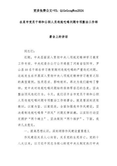 【七哥公文】2025年:在某市党员干部和公职人员违规吃喝问题专项整治工作部署会上的讲话+更多免费公文+VX:QiGeGongWen2024+更多免费公文+VX:QiGeGongWen2024
