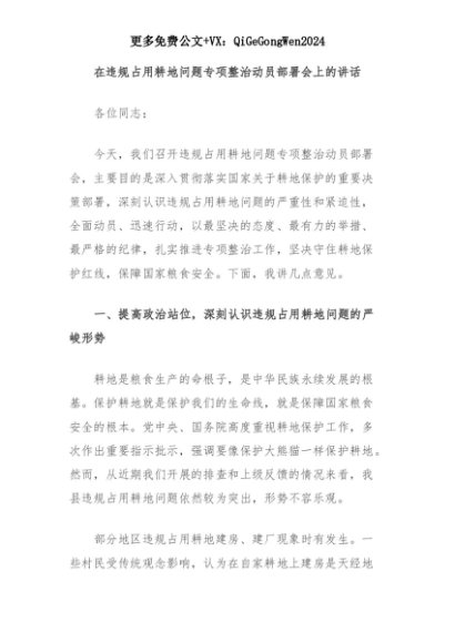 【七哥公文】2025年:在违规占用耕地问题专项整治动员部署会上的讲话+更多免费公文+VX:QiGeGongWen2024+更多免费公文+VX:QiGeGongWen2024