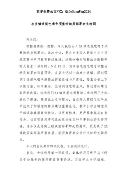 【七哥公文】2025年:在乡镇违规吃喝专项整治动员部署会主持词+更多免费公文+VX:QiGeGongWen2024+更多免费公文+VX:QiGeGongWen2024