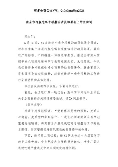 【七哥公文】2025年:在全市违规吃喝专项整治动员部署会上的主持词+更多免费公文+VX:QiGeGongWen2024+更多免费公文+VX:QiGeGongWen2024