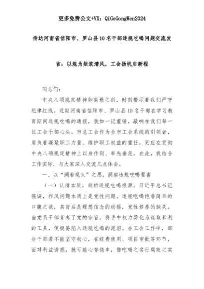 【七哥公文】2025年:传达河南省信阳市、罗山县10名干部违规吃喝问题交流发言:以规为矩筑清风,工会扬帆启新程+更多免费公文+VX:QiGeGongWen2024+更多免费公文+VX:QiGeGongWen2024