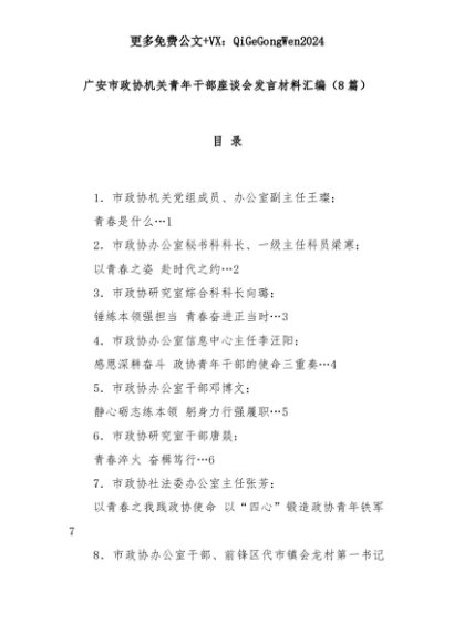 【七哥公文】2025年:(8篇)广安市政协机关青年干部座谈会发言材料汇编+更多免费公文+VX:QiGeGongWen2024+更多免费公文+VX:QiGeGongWen2024