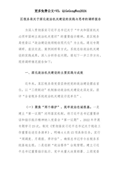 【七哥公文】2025年:区税务局关于深化政治机关建设的实践与思考的调研报告+更多免费公文+VX:QiGeGongWen2024+更多免费公文+VX:QiGeGongWen2024