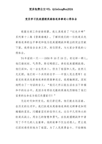 【七哥公文】2025年:党员学习抗美援朝英雄杨连弟事迹心得体会+更多免费公文+VX:QiGeGongWen2024+更多免费公文+VX:QiGeGongWen2024