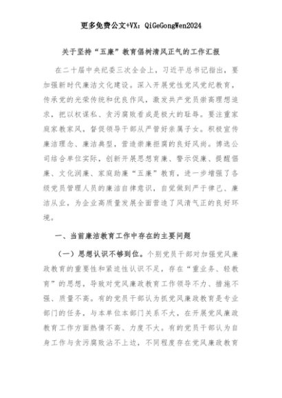 【七哥公文】2025年:关于坚持“五廉”教育倡树清风正气的工作汇报+更多免费公文+VX:QiGeGongWen2024+更多免费公文+VX:QiGeGongWen2024