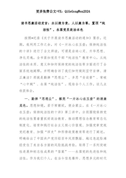 【七哥公文】2025年:读书思廉活动发言:水以清为贵,人以廉为尊,置顶“纯洁性”,永葆党员政治本色+更多免费公文+VX:QiGeGongWen2024+更多免费公文+VX:QiGeGongWen2024
